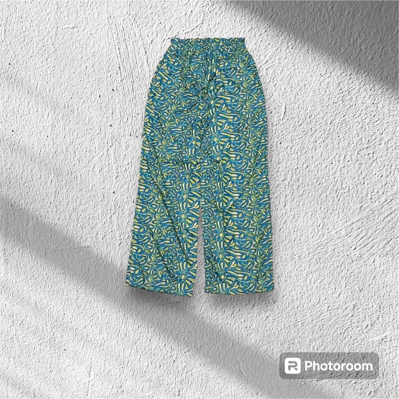 この夏、話題のアフリカンファブリックを使ったカラフルな青柄のロングパンツ。